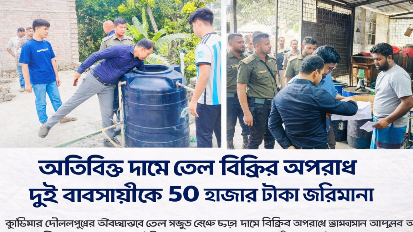 মনোলোক : ককুষ্টিয়ার দৌলতপুরে জনসাধারণের অভিযোগের পরিপ্রেক্ষিতে ভ্রাম্যমাণ আদালতের অভিযান পরিচালিত হয়েছে। বুধবার বিকেল পাঁচটার দিকে উপজেলার সেন্টার মোড় এলাকায় এই অভিযান চালানো হয়। অভিযানে অবৈধভাবে জ্বালানি তেল মজুদ ও অতিরিক্ত দামে বিক্রির অপরাধে দুই ব্যবসায়ীকে ৫০ হাজার টাকা অর্থদণ্ড করা হয়েছে।