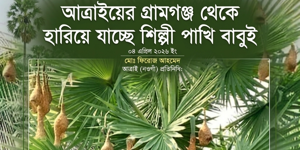 মোঃ ফিরোজ আহমেদ.আত্রাই (নওগাঁ) : “বাবুই পাখিরে ডাকি, বলিছে চড়ই…”—কবি রজনীকান্ত সেনের সেই বিখ্যাত কবিতার বাবুই পাখি আজ যেন শুধুই স্মৃতির পাতায়। এক সময় গ্রামবাংলার আকাশ-প্রকৃতি জুড়ে থাকা এই শিল্পী পাখি এখন আত্রাইয়ের গ্রামগঞ্জ থেকে প্রায় হারিয়ে যেতে বসেছে।