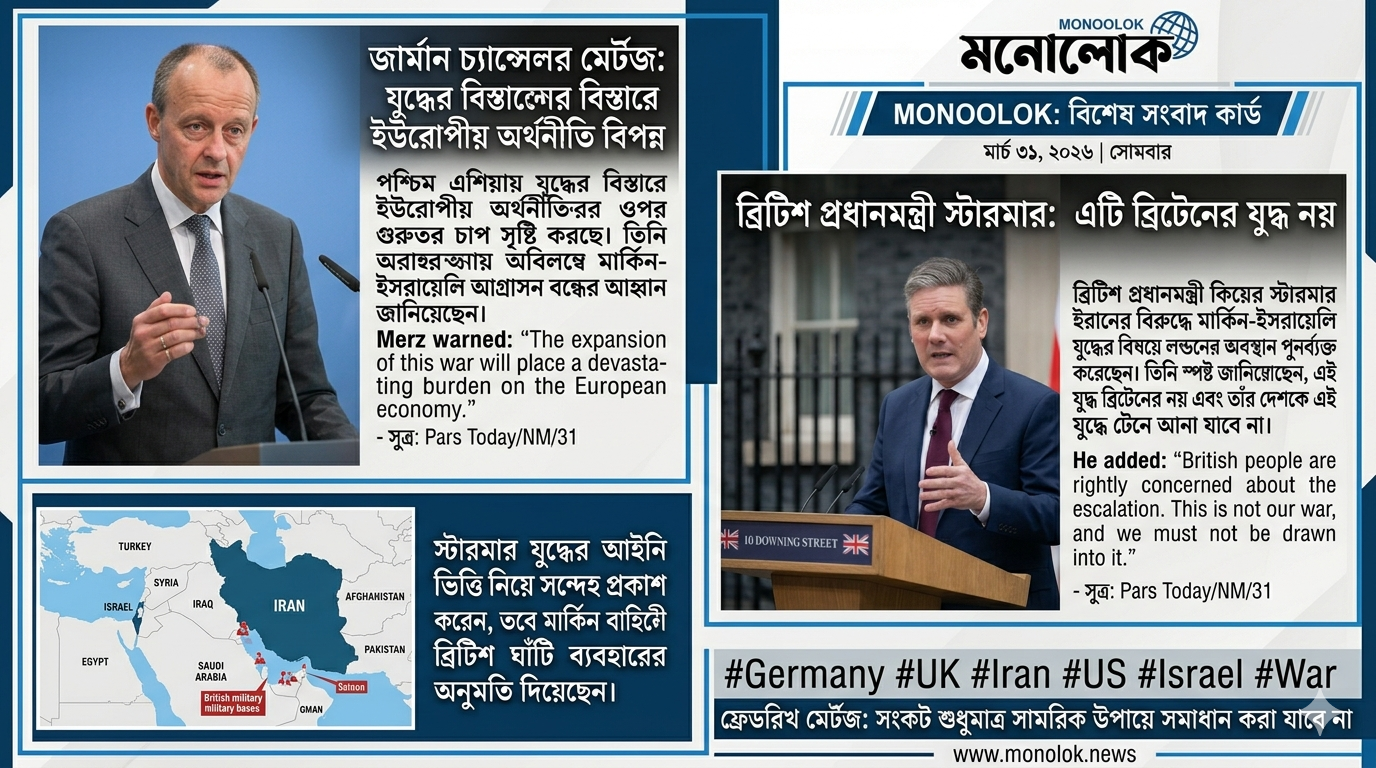 মনোলোক : মার্চ ৩১, ২০২৬ ;-ব্রিটিশ প্রধানমন্ত্রী কিয়ের স্টারমার ইরানের বিরুদ্ধে মার্কিন-ইসরায়েলি আগ্রাসন বিষয়ে লন্ডনের অবস্থান পুনর্ব্যক্ত করেছেন।