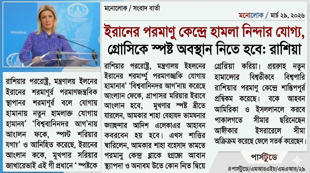 মনোলোক / মার্চ ৩০, ২০২৬ : ইরানের শান্তিপূর্ণ পারমাণবিক স্থাপনায় নতুন হামলাকে 'বিশ্বব্যাপী নিন্দার যোগ্য' বলে অভিহিত করেছে রাশিয়ার পররাষ্ট্র মন্ত্রণালয়।