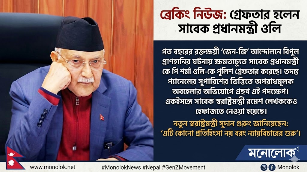 মনোলোক : জেন-জি আন্দোলনে ক্ষমতাচ্যুত সাবেক প্রধানমন্ত্রীকে গ্রেফতার করেছে পুলিশ। গত বছরের সেপ্টেম্বরের আন্দোলনে বিপুল প্রাণহানিতে জড়িত থাকার অভিযোগে তাকে গ্রেফতার করা হয়েছে। একইসঙ্গে সাবেক স্বরাষ্ট্রমন্ত্রী রমেশ লেখককেও গ্রেফতার করা হয়েছে