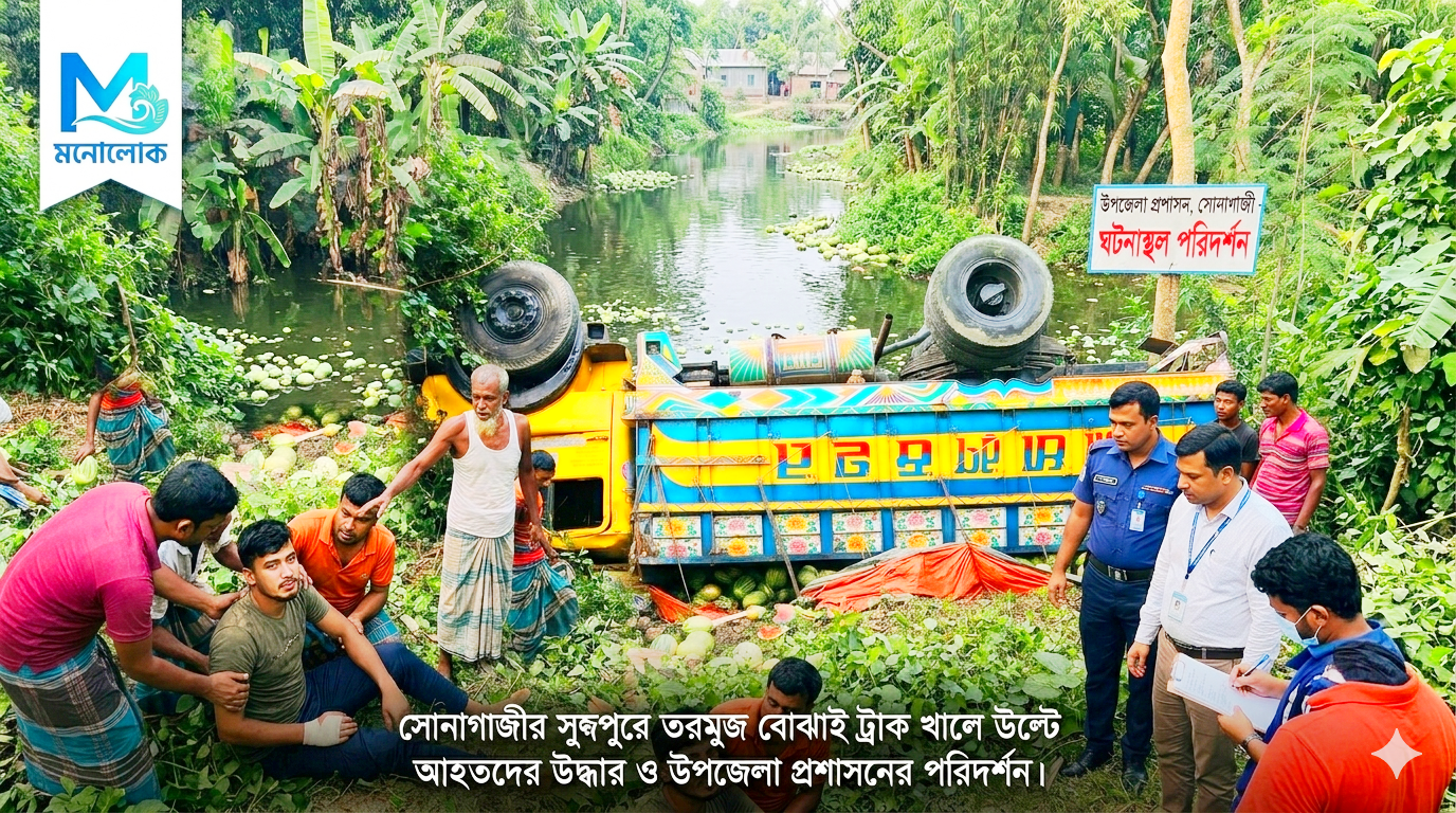 তরমুজ চাষিদের বুকফাটা আর্তনাদ: সোনাগাজীতে নিয়ন্ত্রণ হারিয়ে খালে উল্টে গেল তরমুজ বোঝাই ট্রাক