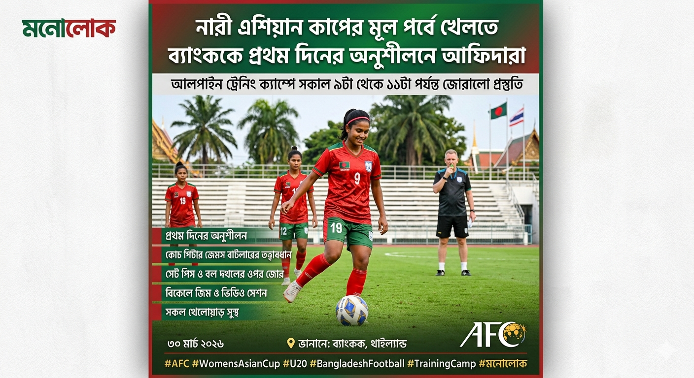 মনোলোক : ৩০ মার্চ ২০২৬. : এএফসি অনূর্ধ্ব-২০ নারী এশিয়ান কাপের মূল পর্বে খেলতে এখন থাইল্যান্ডের রাজধানী ব্যাংককে অবস্থান করছেন আফিদা খন্দকাররা। ব্যাংককে পৌঁছার পর গতকাল সকালে প্রথম দিনের অনুশীলন সারলেন তারা। আলপাইন ট্রেনিং ক্যাম্পের মাঠে সকাল ৯টা থেকে ১১টা পর্যন্ত চলে লাল-সবুজদের অনুশীলন। এশিয়ান ফুটবল কনফেডারেশন (এএফসি) টুর্নামেন্টের প্রোটোকল অনুযায়ী এবং এএফসি কর্তৃক নির্ধারিত মাঠে এই আনুষ্ঠানিক অনুশীলন শুরু হয় বাংলাদেশ দলের। এই সেশনে কাঠামোগত ওয়ার্মআপ, টেকনিক্যাল ড্রিল এবং বল দখলের ওপর ভিত্তি করে অনুশীলন হয়। শেষের দিকে সেট পিস নিয়ে অনুশীলন করান কোচ পিটার জেমস বাটলার।