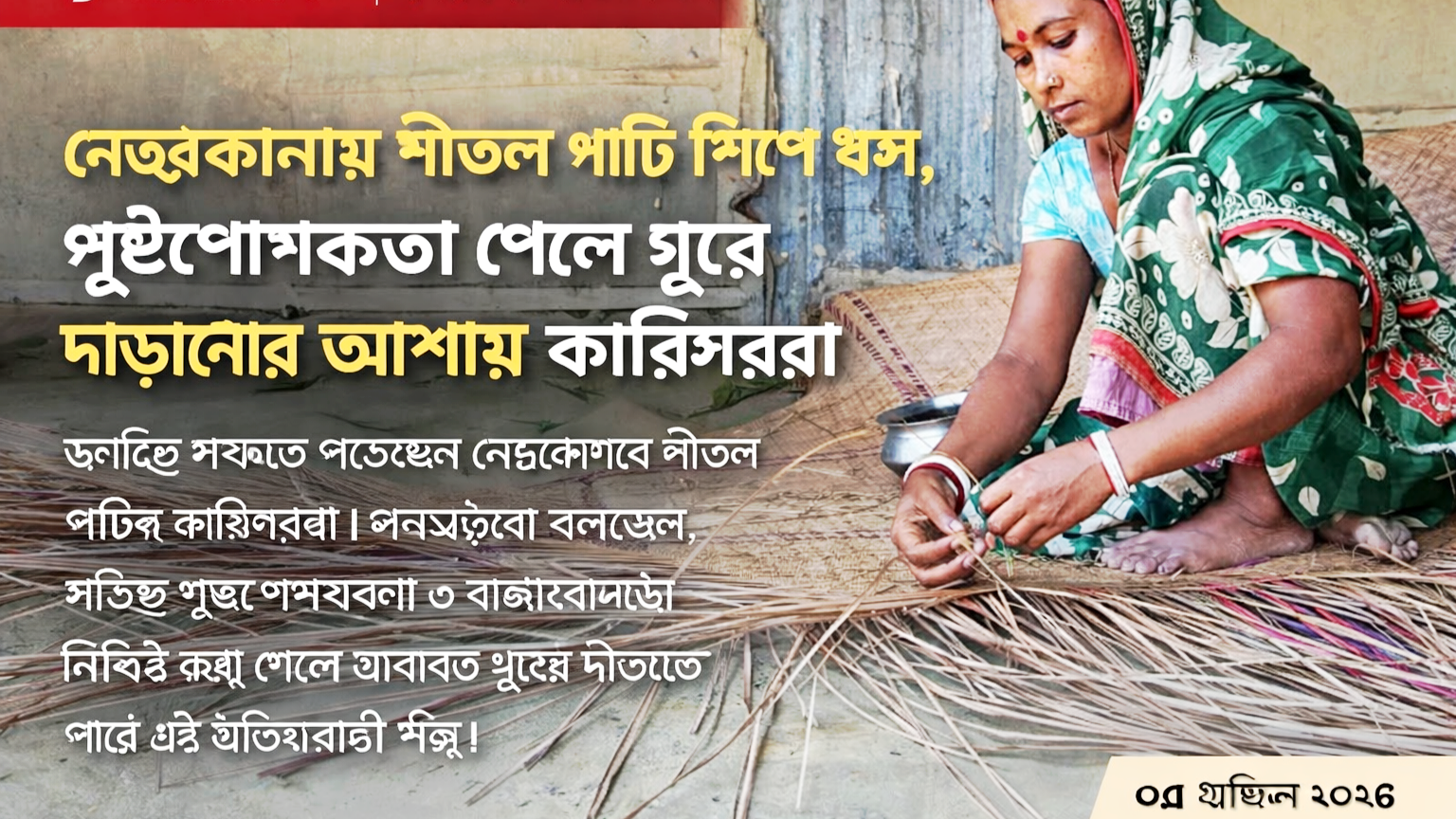 নেত্রকোনায় শীতল পাটি শিল্পে ধস, পৃষ্ঠপোষকতা পেলে ঘুরে দাঁড়ানোর আশায় কারিগররা