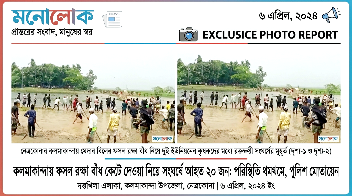 সোহেল খান দূর্জয়- নেত্রকোনা : নেত্রকোনা জেলার কলমাকান্দা উপজেলার বড়খাপন ও পোগলা ইউনিয়নের কৃষকদের মধ্যে ফসল রক্ষা বাঁধকে কেন্দ্র করে সংঘর্ষে উভয় পক্ষের অন্তত ২০ জন আহত হয়েছে। রোববার (৫ এপ্রিল) দুপুরে কলমাকান্দা উপজেলার বড়খাপন ইউনিয়নের দত্তখিলা-নাগেরগাতী এলাকায় ঘটনাটি ঘটেছে।স্থানীয় সূত্রে জানা যায়, দত্তখিলা-নাগেরগাতী ফসল রক্ষা বাঁধ দেওয়ার কারণে মেদার বিলের পানি স্বাভাবিকভাবে দত্তখিলা খালে নামতে পারছিল না।কৃষকদের আশঙ্কা, মেদার বিলে পানি ঢুকে পড়লে সেখানে চাষ করা ধান নষ্ট হয়ে যাবে। এ কারণে বড়খাপন ইউনিয়নের কৃষকরা ফসল রক্ষায় বাঁধ নির্মাণ করেন। তবে এ বাঁধের ফলে বৃষ্টির পানি নিষ্কাশন ব্যাহত হয়ে পোগলা ইউনিয়নের কান্দুলিয়া বিলের জমি পানিতে তলিয়ে যাওয়ার উপক্রম হয়।