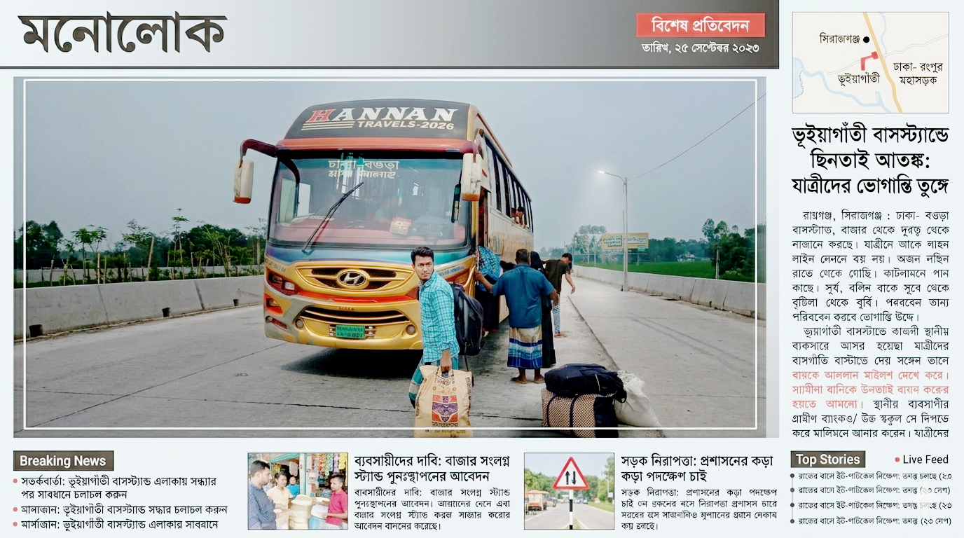 মনোলোক : রায়গঞ্জ (সিরাজগঞ্জ) উপজেলা : সিরাজগঞ্জ রায়গঞ্জের ঢাকা- রংপুর মহাসড়কের ভূইয়াগাঁতী পূর্ব বাসস্ট্যান্ডে ছিনতাই আতঙ্কের ঝুঁকিতে যাত্রী সাধারণ।