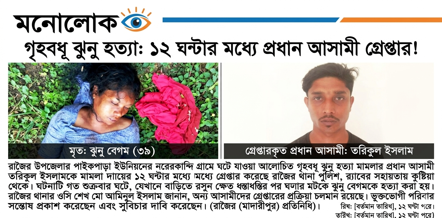 মনোলোক : রাজৈর (মাদারীপুর) : রাজৈরের আলোচিত গৃহবধূ ঝুনু হত্যার মামলার প্রধান আসামী তরিকুল ইসলামকে গ্রেপ্তার করেছে রাজৈর থানা পুলিশ।এতে ভুক্তভোগী পরিবার সন্তোষ প্রকাশ করেছেন।