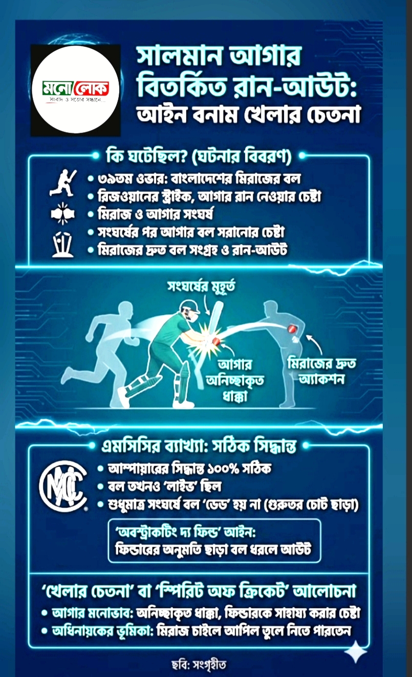 মনোলোক : ঢাকার মিরপুরে বাংলাদেশ-পাকিস্তান দ্বিতীয় ওয়ানডে ম্যাচে একটি নাটকীয় রানআউট ঘিরে ক্রিকেট অঙ্গনে ব্যাপক আলোচনা তৈরি হয়েছে। ম্যাচের ৩৯তম ওভারে বাংলাদেশের অধিনায়ক মেহেদী হাসান মিরাজ বল করছিলেন। স্ট্রাইকার মোহাম্মদ রিজওয়ান বলটি বোলারের দিকে ঠেলে দিলে নন-স্ট্রাইকার সালমান আগা সিঙ্গেলের জন্য দৌড় শুরু করেন। এ সময় মিরাজের সঙ্গে তার ধাক্কা লাগে এবং তিনি বলটি সরানোর বা ধরার চেষ্টা করেন। সুযোগ বুঝে মিরাজ বল কুড়িয়ে স্টাম্পে আঘাত করে রানআউট সম্পন্ন করেন।