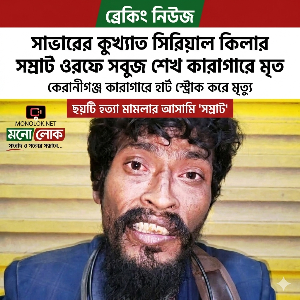 মনোলোক : সূত্রের খবরে জানা যায়, সাভারের একাধিক মানুষের বুক কাঁপানো কুখ্যাত সিরিয়াল কিলার ‘সম্রাট’ ওরফে সবুজ শেখ কেরানীগঞ্জ কেন্দ্রীয় কারাগারের ৪ নম্বর কনডেমড সেলে আজ ভোর আনুমানিক ৪:২০ মিনিটে শেষ নিশ্বাস ত্যাগ করে। ভোররাতের নীরবতা ভেঙে কর্তব্যরত রক্ষীরা যখন সম্রাটকে চিকিৎসকের কাছে নিয়ে যায়, ততক্ষণে দেরি হয়ে গিয়েছিল। কর্তব্যরত ডাক্তার দ্রুততম চেকআপের পর জানায়, একটি ব্যাপক হার্ট অ্যাটাকের কারণেই তার এই আকস্মিক মৃত্যু।