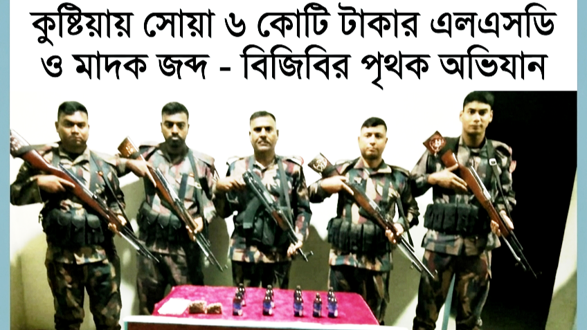 বিজিবি সূত্রে জানা যায়, সোমবার (২৩ মার্চ) রাত আনুমানিক ৮:৩০ মিনিটে গোপন সংবাদের ভিত্তিতে কুষ্টিয়া ব্যাটালিয়ন সদরের একটি বিশেষ টহল দল মিরপুর রেল স্টেশন এলাকায় অভিযান পরিচালনা করে। রাজশাহী থেকে ঢাকাগামী ‘মধুমতি এক্সপ্রেস’ ট্রেনে তল্লাশি চালিয়ে পরিত্যক্ত অবস্থায় ১২ বোতল (প্রতি বোতল ৫০ মিলি) ভারতীয় এলএসডি উদ্ধার করা হয়। উদ্ধারকৃত এই উচ্চমূল্যের মাদকের আনুমানিক বাজার মূল্য ধরা হয়েছে প্রায় ৬ কোটি ২৪ লক্ষ টাকা।